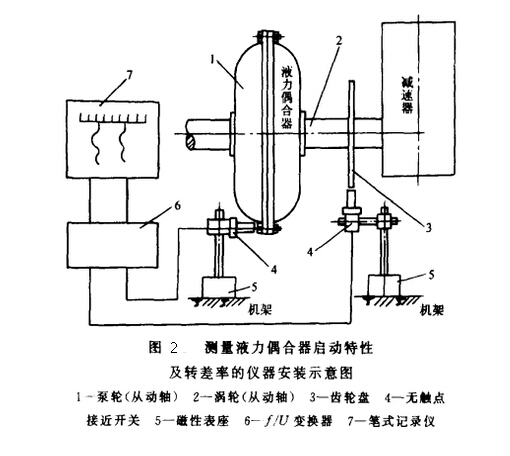 目前,大型帶式輸送機的驅(qū)動均采用了液力偶合器,目的是為了節(jié)約能量,限制起動力矩,改善起動特性,保護膠帶。轉(zhuǎn)差率的測量方法如圖2是在渦輪從動軸2上裝一個齒輪盤3,再用一個快速反應(yīng)的接近開關(guān)4裝在磁性表座5上,磁性座吸附在機架上。當(dāng)接近開關(guān)靠近齒輪盤時,接近開關(guān)受旋轉(zhuǎn)齒輪盤的影響產(chǎn)生一脈沖串 、轉(zhuǎn)速越高,脈沖頻率越高。再將脈沖頻率轉(zhuǎn)變成與之成正比的電壓,用一個筆試記錄儀記錄,就能測量液力偶合器從起動開始到穩(wěn)定運行的速度變化過程。
