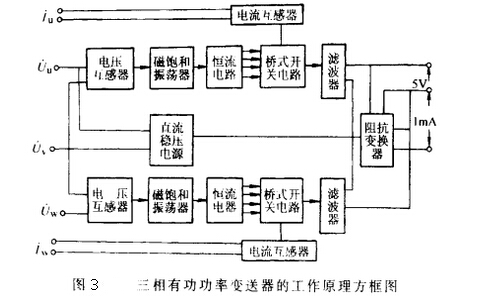 三相有功功率變送器是用于工頻電網(wǎng)測量電動機三相有功功率專用儀器,其工作原理如圖3所示,從圖中可見,變送器主要部分為兩套完全相同的功率測量部件。每一套功率測量部件為一個時間差值的乘法器。它由磁飽和振蕩器、恒流電路、橋式開關(guān)電路、電壓和電流互感器組成。這種由兩單相功率測量部件的輸出串聯(lián)相加,在負(fù)載上產(chǎn)生一個輸出電壓用來測量三相功率的方法稱為三元件測試方法。