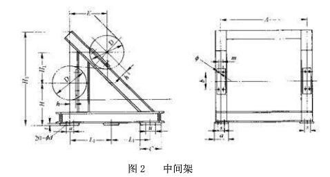 4、中間架(如圖2)用于安裝托輥。標(biāo)準(zhǔn)長(zhǎng)度為6000mm,非標(biāo)長(zhǎng)度為3000-6000mm及凸凹弧度中間架;支腿有I型(無(wú)斜撐)、H型(有斜撐)兩種。中間架和中間架支腿全部采用螺栓聯(lián)接,便于輸送和安裝。